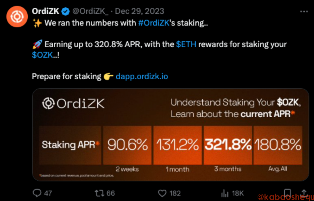 OrdiZK的项目名称囊括当前两大行业热点,十分吸引眼球。项目上线后,项目方通过宣传高额回报来吸引用户参与。在OrdiZK已删除的一篇公告中我们可以看到,他们宣称OZK的质押年化收益达到了夸张的321.8%。