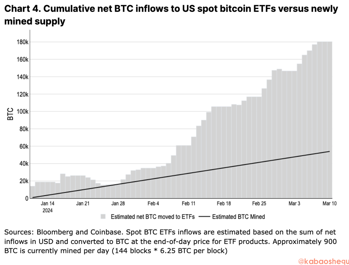 此外,我们认为,随着美国现货 BTC ETF 的出现,比特币的市场动态已经发生了根本性的变化。在短短两个月内,其净流入就达到了数十亿美元,这不可逆转地改变了格局。现在,主要机构参与者已经能够通过这些工具进行投资,比特币对本次减半的反应可能不一定能从前三个周期的表现中反映出来。我们认为,了解当前的技术供需情况更为重要,它可以帮助我们更好地了解比特币的潜力。