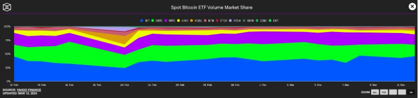 从市场占比来说,也很符合我们从成交量里看到的比例:从二月中开始有一段明显的下滑,其中 VanEck 的 HODL 占比逐渐上升;但自那之后,就恢复了 IBIT 第一,GBTC 第二,FBTC 第三的位置,Ark 等小玩家紧随其后,且在牛市之后,贝莱德的 IBIT 占比还出现了大幅提升,从此前的 33% 左右跃升至如今的 45% 左右。