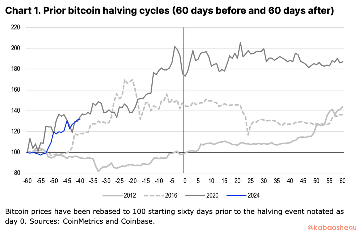 · 随着第四次比特币减半的临近,我们认为对前几个周期的研究应谨慎解读,因为样本量小,难以将其模式泛化到即将发生的未来。