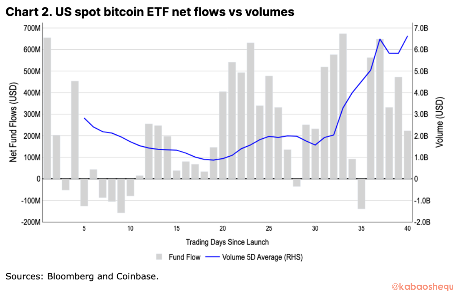 从中期来看,我们可能会看到 ETF 继续保持甚至增加当前的流动性,因为大型券商还没有开始向客户提供这些产品。由于目前美国货币市场基金中仍有超过 6 万亿美元的资金,加上即将到来的降息,我们认为仅在今年就有很多闲置资本可以进入这一资产类别。