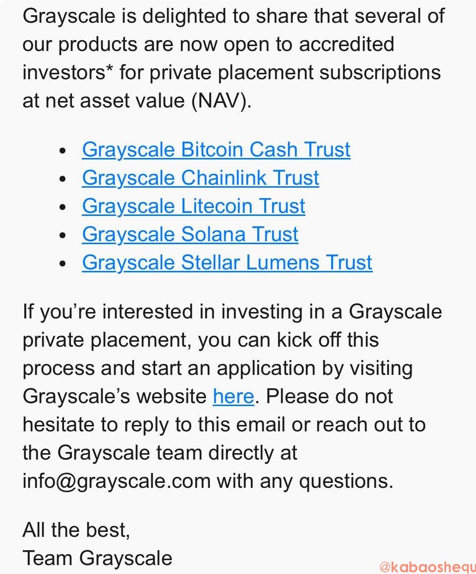 2 月 15 日,灰度邮件通知显示,已向认可的投资者开放部分加密货币信托的私募配售认购,包括 Grayscale Bitcoin Cash Trust、Grayscale Chainlink Trust、Grayscale Litecoin Trust、Grayscale Solana Trust、Grayscale Stellar Lumens Trust,其中认购将以资产净值(NAV)进行。