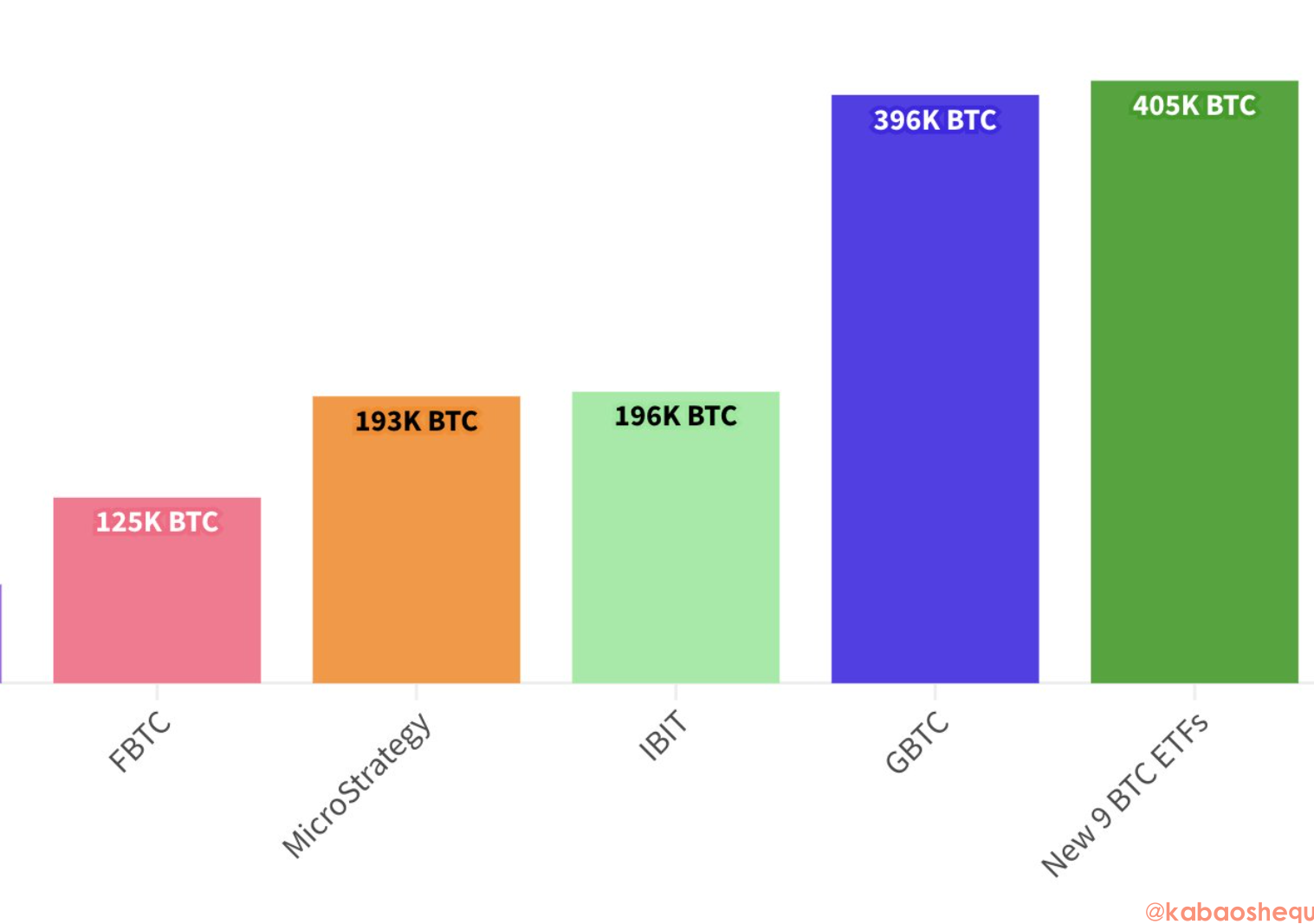 9 支现货比特币 ETF 的 BTC 持仓量达 40.5 万枚 BTC,超越 GBTC 持仓的 39.6 万枚 BTC,2 个月狂飙突进,颠覆了 GBTC 5 年来的龙头地位