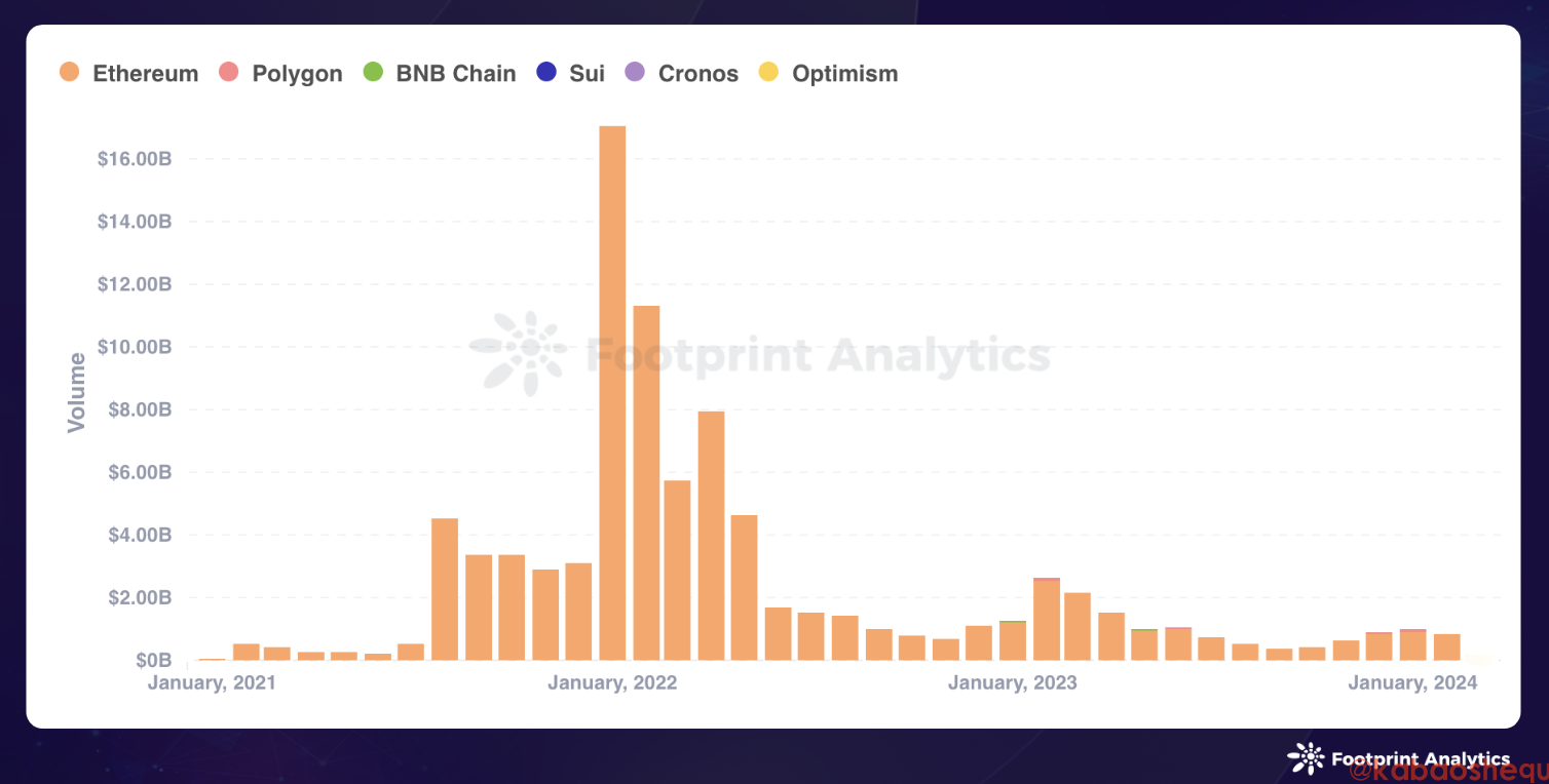 分析以太坊、Polygon、BNB 链、Cronos、Optimism 和 Sui 等公链的数据,我们发现交易量降至 8.4 亿美元,较 1 月份下降了 16.1%。同时,交易量下滑了 25.8%,独立用户(钱包)数量也减少了 14.6%。这种下降趋势部分归因于2月份天数较少。此外,关键 NFT 系列出现明显波动,市场动态的变化和投资者情绪的转变,也是造成下滑趋势的原因。