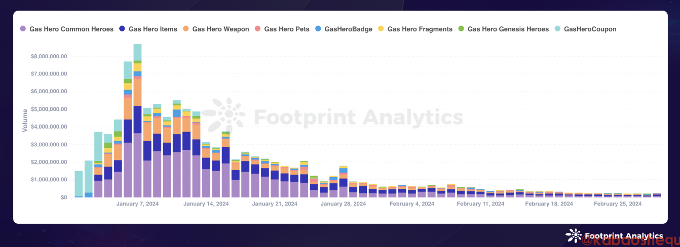 根据Footprint Analytics的数据,2 月,Find Satoshi Lab 开发的 Web3 游戏Gas Hero的 NFT 交易量大幅下跌 87.2%,降至 1,230 万美元,这与其 1 月份上线当月 9,610 万美元交易量形成鲜明对比。此下降对 Polygon 和 Mooar 平台的交易活动产生了显著影响,交易量明显减少。Gas Hero 团队于 2 月 28 日宣布战略调整,重回封闭测试阶段,以优化经济模型并提升用户体验。